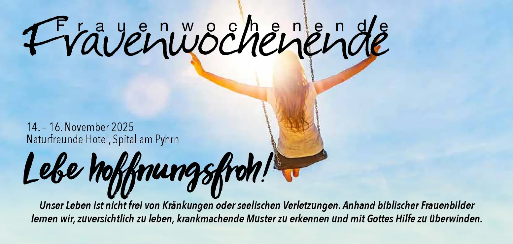 Unser Wunsch ist es, Frauen eine Begegnung mit dem lebendigen Gott in einer Atmosphäre, die von Liebe, Echtheit und Wertschätzung geprägt ist, anzubieten. Wir freuen uns, wenn du bei diesem Wochenende dabei bist!
